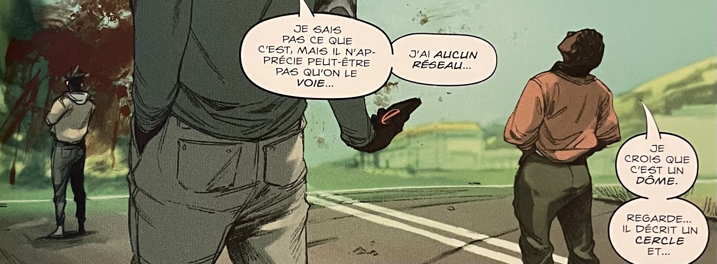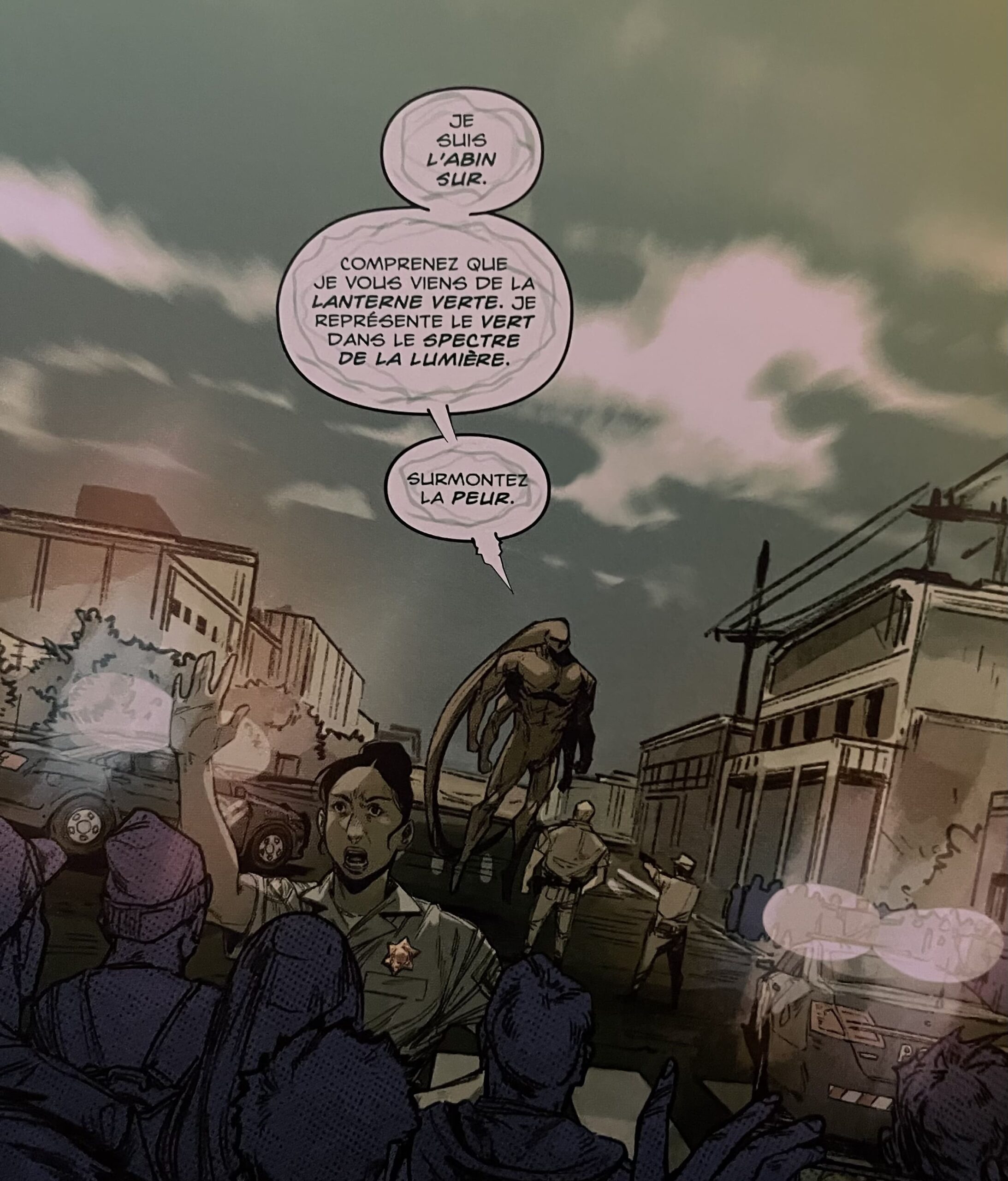 Le premier tome d’Absolue Green Lantern est assez cryptique mais pas pour autant inintéressant. Je dirais même que le mystère et l’ambiance oppressante qu’il entretient en sont captivants. Elles nous poussent à avancer dans la lecture. L’intrigue nous emmène dans une petite ville des États-Unis mise sous cloche par un curieux extraterrestre du nom d’Arbin Sur. Ce dernier, très énigmatique, est venu juger la population. Oui mais pourquoi ? C’est ce que vont tenter de découvrir un groupe d’habitants au nom pas si inconnu (Hal, John…) pendant leur tentative d’évasion.