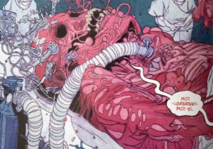 Malgré tout, cela reste une lecture clivante qui se mérite. La narration est en effet morcelée, assez lente et volontairement floue. Nul doute qu’elle ne plaira pas à ceux qui recherchent avant tout de l’action chez les super-héros. Elle risque même de laisser pas mal de lecteurs sur le carreau. J’ai pour ma part pris grand soin de faire des pauses afin de digérer toutes les informations à chaque fois. On regrettera d’ailleurs que le twist final permettant de donner plus de sens à cette narration n’arrive que trop tard. L’idée de Ram V de fournir une nouvelle origin story à Resurrection Man étant pour le moins intéressante, mais ce retard structurel participe à la confusion générale.