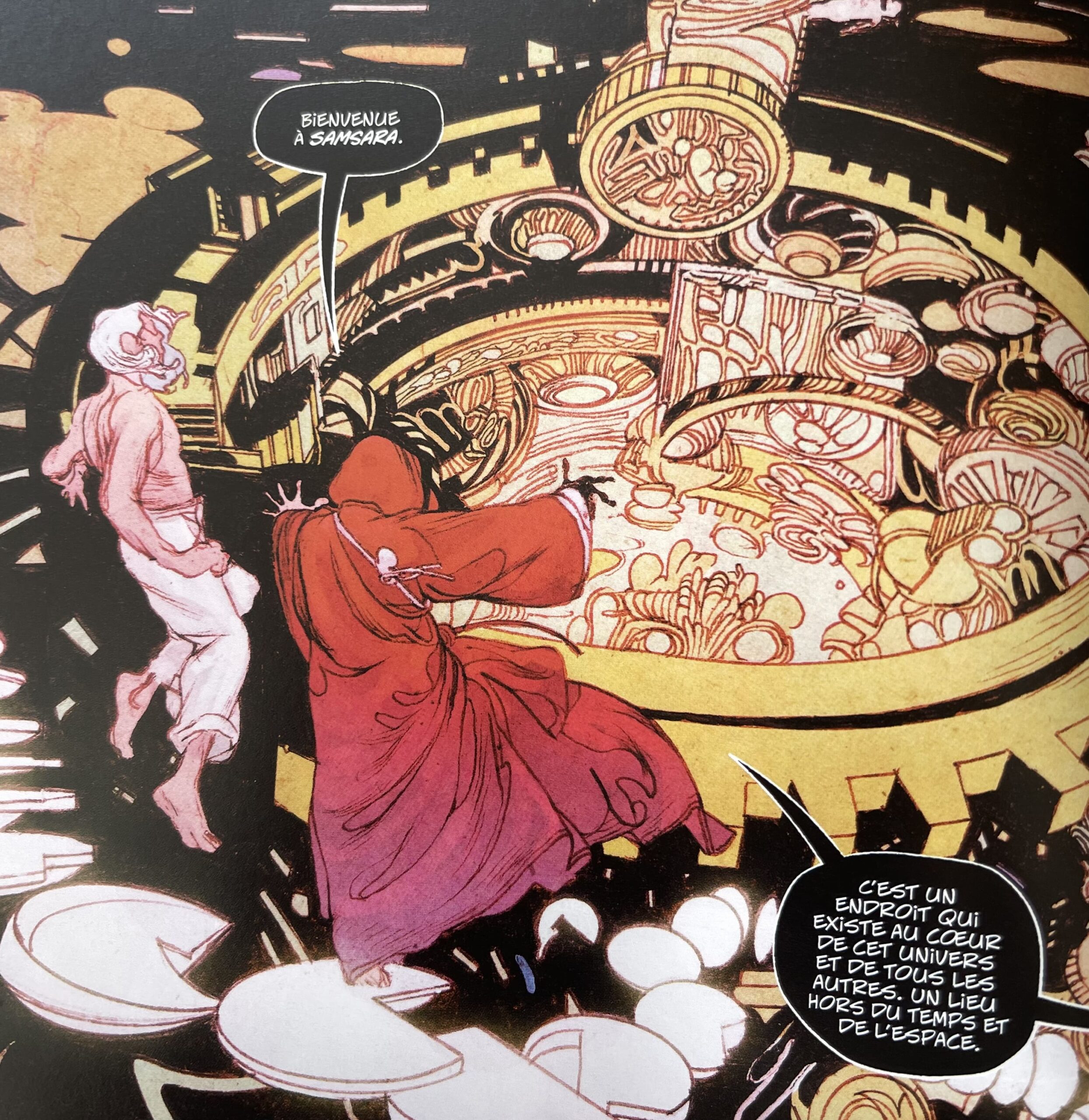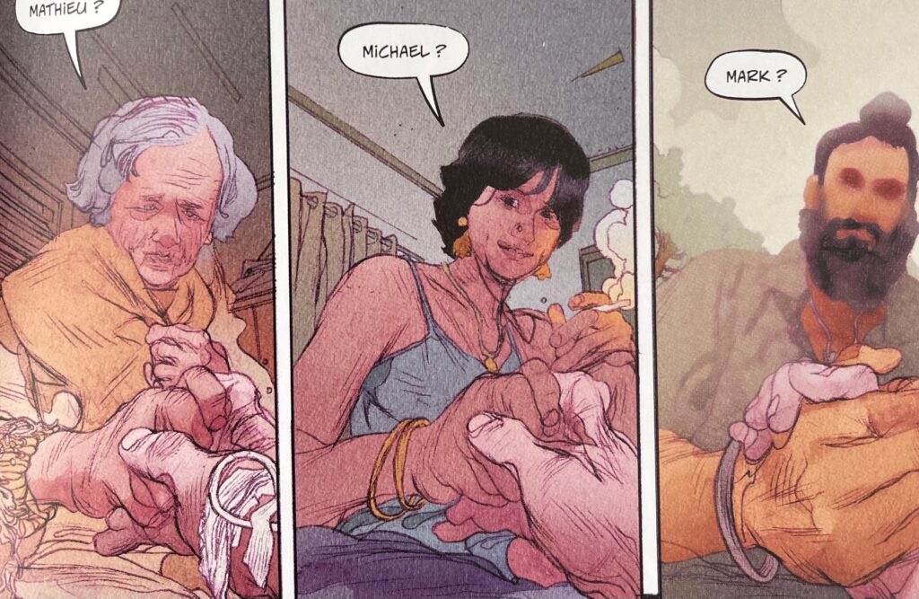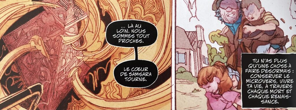 Ils sont qui plus est mis en avant par l’incroyable et peu commun travail graphique d’Anand RK. Les planches bénéficient d’un style fluide, bien souvent organique. Elles soulignent à merveille l’évocation des souvenirs, du temps qui passe et parfois des visages qui s’effacent ou au contraire s’impriment dans la mémoire. À cela s’ajoute un soupçon de body horror qui met en valeur le côté parfois soudain et violent de la mort et un nombre incroyable de détails, particulièrement dans Samsara, une sorte de salle représentant les rouages du temps et de l’espace.
