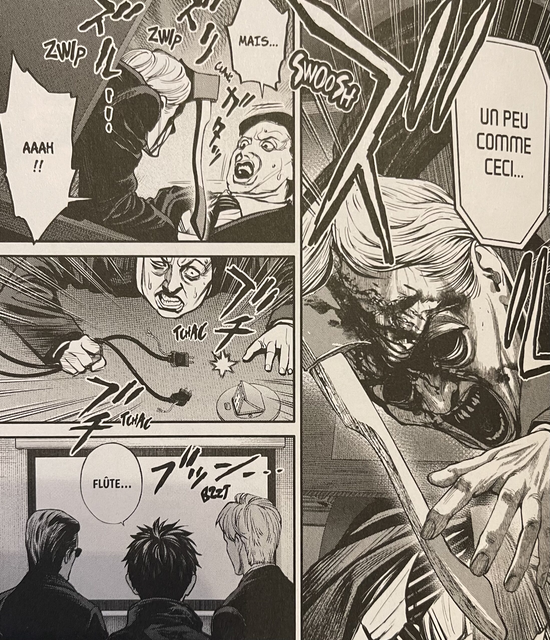 Si les premiers tomes nous avaient habitués à une ambiance glauque, inquiétante sur fond d’ésotérisme et de possession démoniaque, il faut avouer que depuis le tome 4 Éclipse Humaine a pris un autre tournant. En effet, les mumily, ces espèces de démons, ont laissé place à une IA diabolique ainsi qu’à des envahisseurs aliens. L’effroi et l’horreur que créaient ces créatures lors de leurs apparitions a peu à peu été remplacé par un autre type de tension : celle d’un ennemi plus fort et plus nombreux. Une autre forme de peur s’installe alors : celle d’assister à la fin du monde.