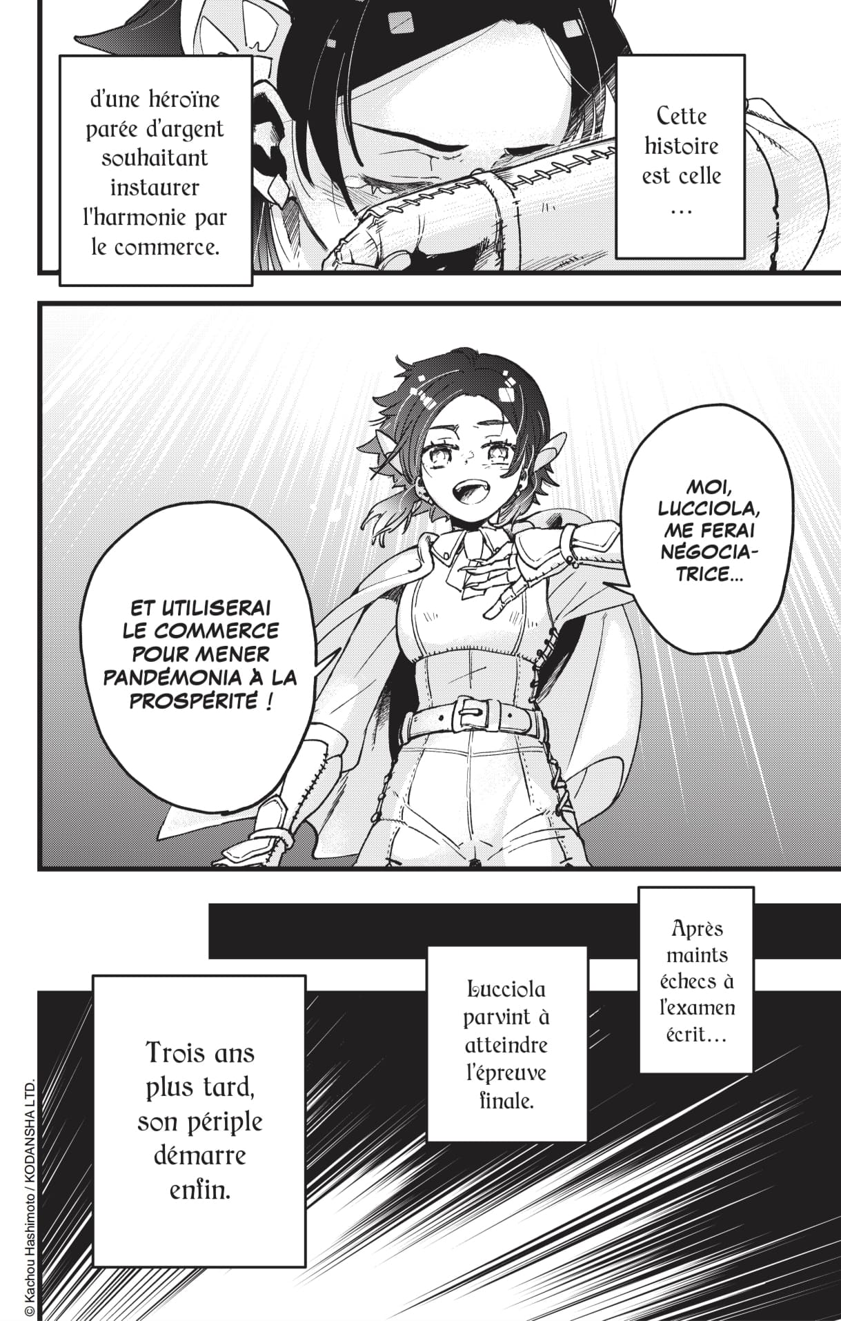 Pandémonia, les terres où s’affrontent monstres et humains, où seule règne la loi du plus fort. Au cœur de ces affrontements se trouve la vaillante Lucciola Lunatria. Lorsque son chemin croise celui de Bilkis Draco, membre de la guilde des marchands, elle découvre un monde très particulier : celui du commerce avec les monstres. Désireuse d’amener la paix en Pandémonia, elle décide alors de rejoindre la guilde. Réussira-t-elle à lier ses aspirations avec celles de cette organisation ?