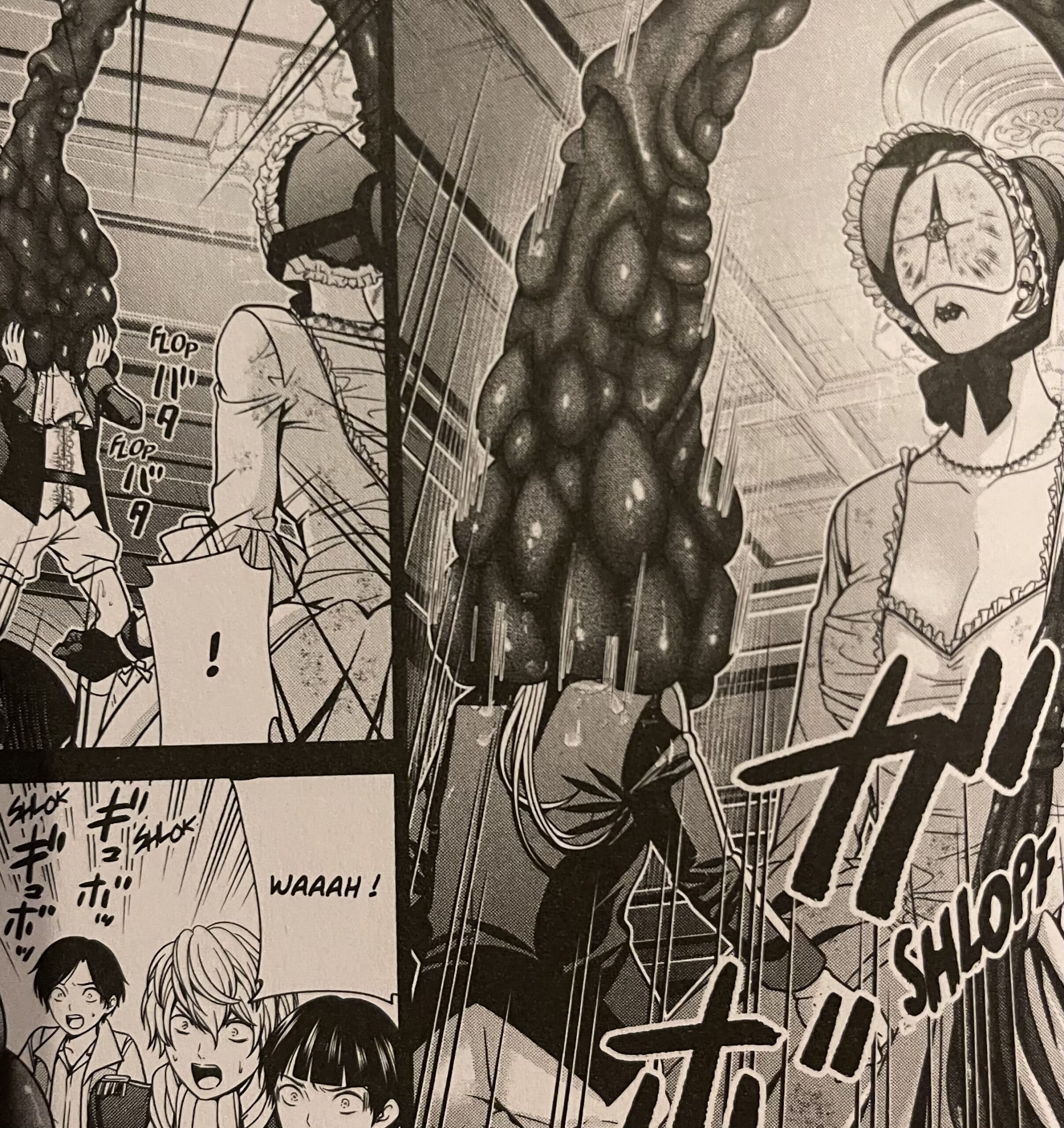 Dès les premières pages, on sent que l’auteur a décidé d’élever l’horreur d’un cran jusqu’à provoquer en nous le même dégoût que ressentent les protagonistes face à leur sort. Notamment grâce à ses visuels toujours aussi précis et explicites. Tous les ingrédients sont réunis. Qu’il s’agisse des gâteaux confectionnés à base de têtes de lycéens ou bien des meurtres perpétrés par ce nouveau bourreau : Marie Antoinette. Son objectif est d’ailleurs bien plus cruel que précédemment : confectionner un collier à partir de membres choisis sur ses victimes.