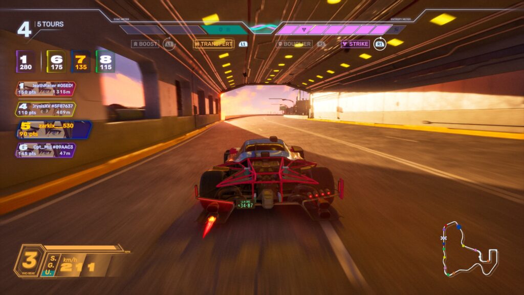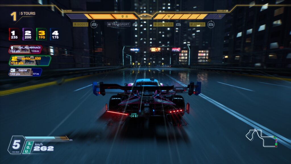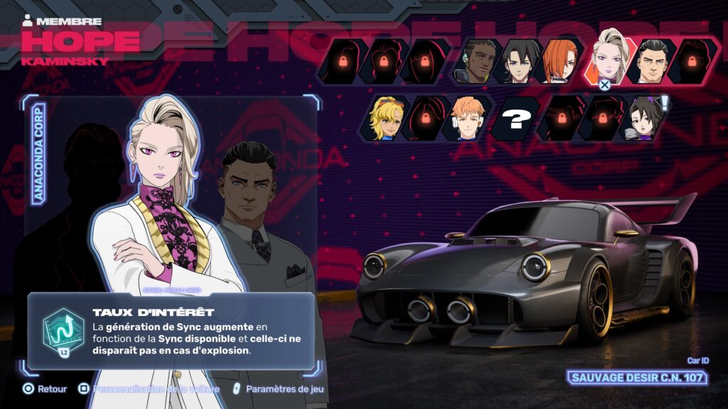 Tout d’abord, le mode “tournoi” sert de colonne vertébrale au jeu, avec cinq équipes prêtes à en découdre. Chaque groupe intègre trois membres aux caractères variés mais quelque peu clichés. Un mystérieux organisateur orchestre le tournoi Screamer ou chacun veut participer pour prouver qu’il est le meilleur. Cependant, la narration patine rapidement, malgré un univers cyberpunk prometteur et une mise en scène inspirée des animés. En effet, l’ensemble rappelle Galactik Football, avec des personnages qui font avancer une intrigue peu palpitante. Ainsi, le récit laisse une impression aussi tiède qu’une course sans dépassement malgré quelques vidéos de belles qualité.