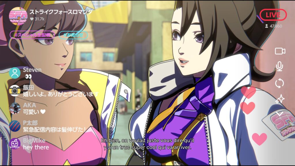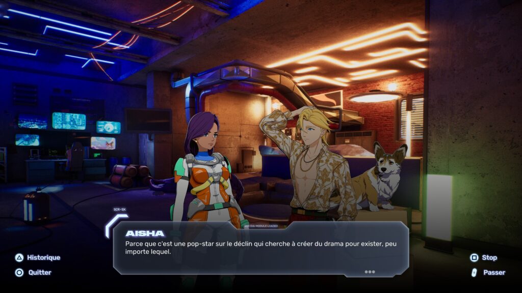 Ensuite, le jeu propose vingt quatre épisodes ponctués de courtes scénettes, censées dynamiser la progression. On enchaine alors des dialogues en différentes langues mais avec un texte traduit en français car l’ensemble des personnages se comprennent grâce à une puce implantée dans leurs cerveaux. D’ailleurs, ce concept cyberpunk intrigue au départ mais il s’essouffle vite. De plus, le mode scénario tente d’imiter Ridge Racer Type 4 avec une approche stylisée, mais sans atteindre son efficacité. Par conséquent, le mode histoire existe, mais n’apporte finalement que peu d’intérêt au joueur là ou il aurait pu se rapprocher d’un jeu comme Racing Lagoon.