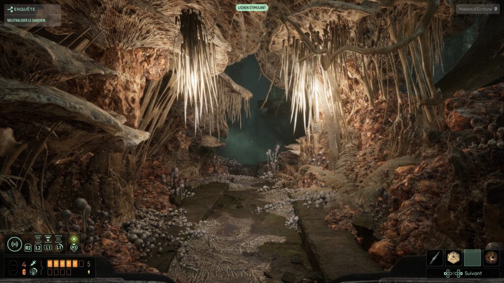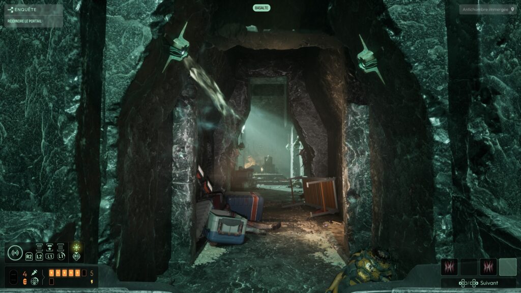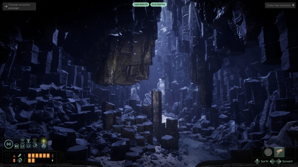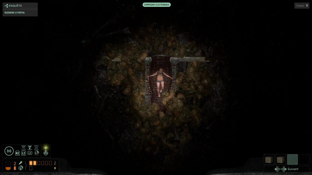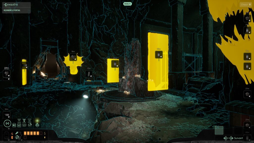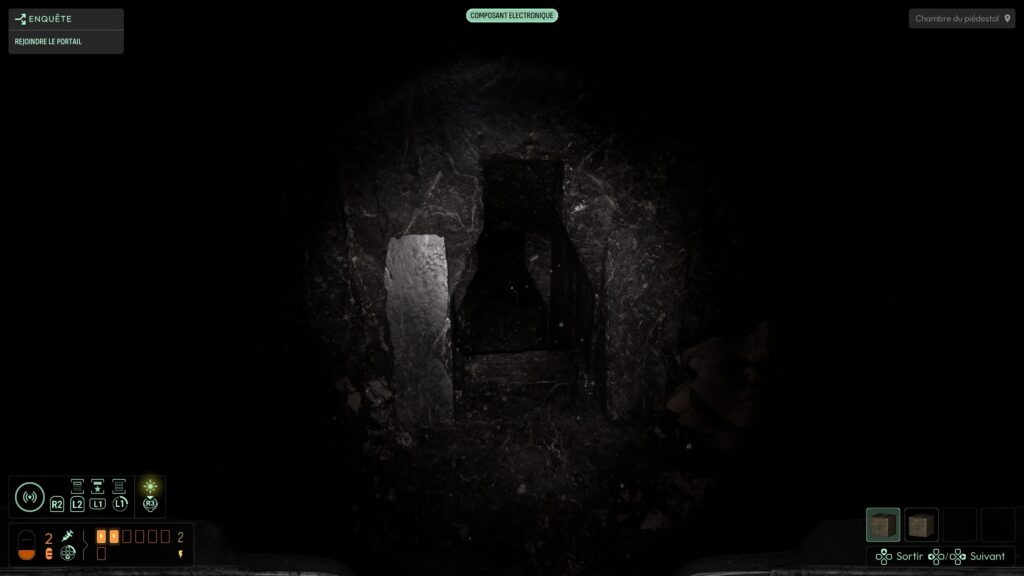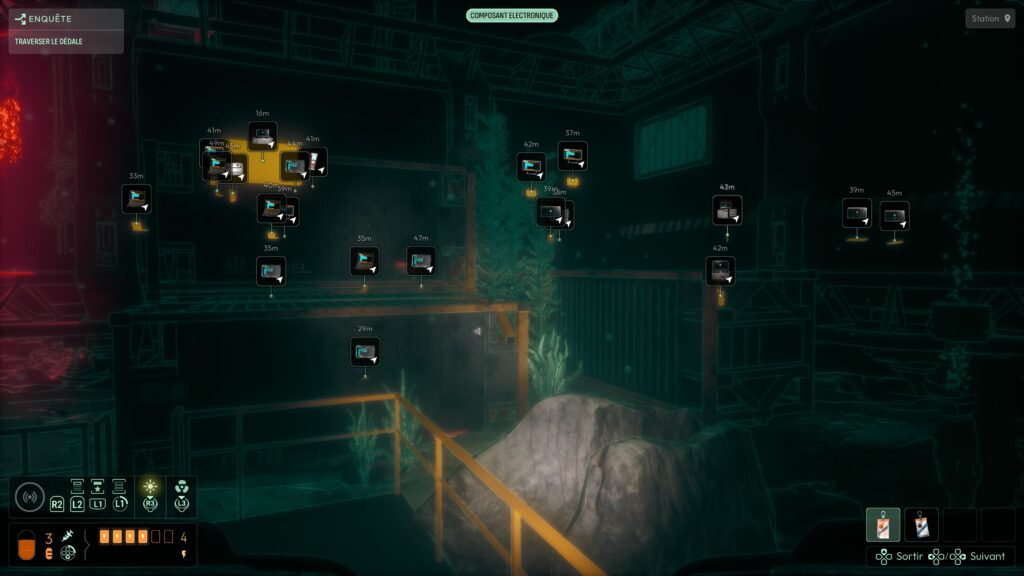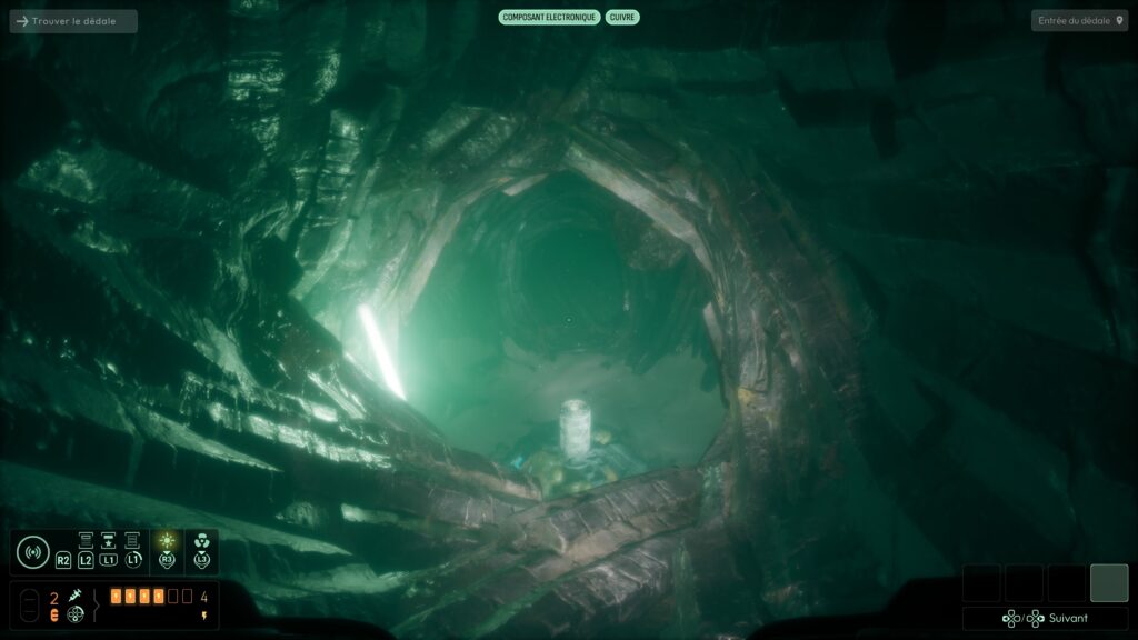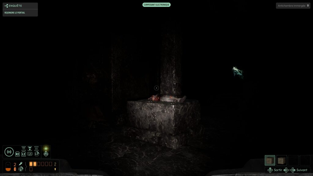 On est livré à nous‑mêmes pour explorer, lire les indices, discerner les chemins possibles. Pour nous aider, il faut découvrir des matières spécifiques et les ajouter à un système de sonar. Celui‑ci permet ensuite de « scanner » des éléments et de les localiser dans l’environnement, ce qui donne une vraie impression de recherche active, plutôt que de suivre une ligne continue. Cette absence de guidage classique est l’un des points les plus réussis du jeu : elle force le joueur à observer, à cartographier mentalement les lieux, à connecter les indices, plutôt que de se laisser balader par un GPS intégré. C’est exactement le type d’expérience que j’attends d’un jeu d’exploration horrifique.