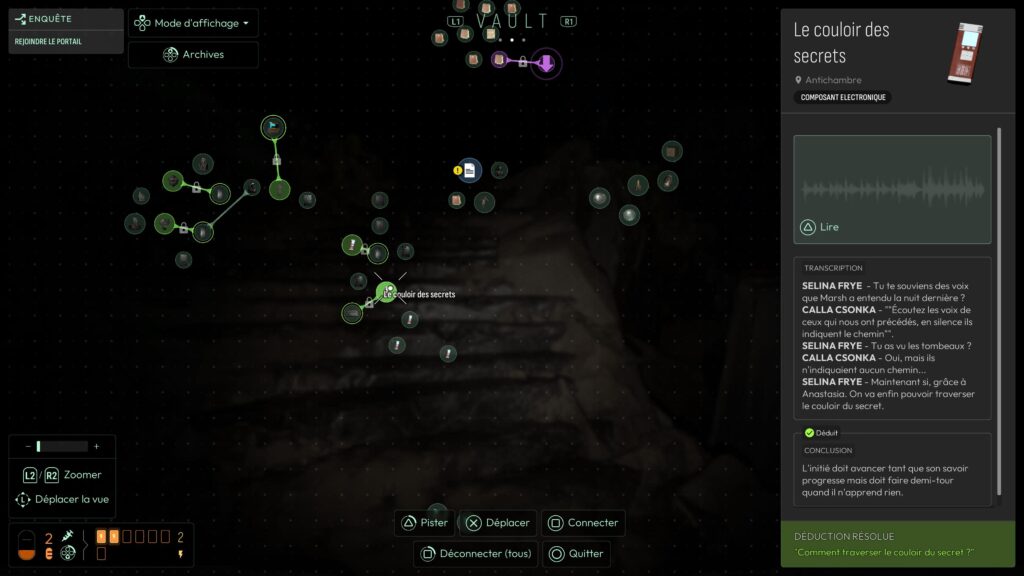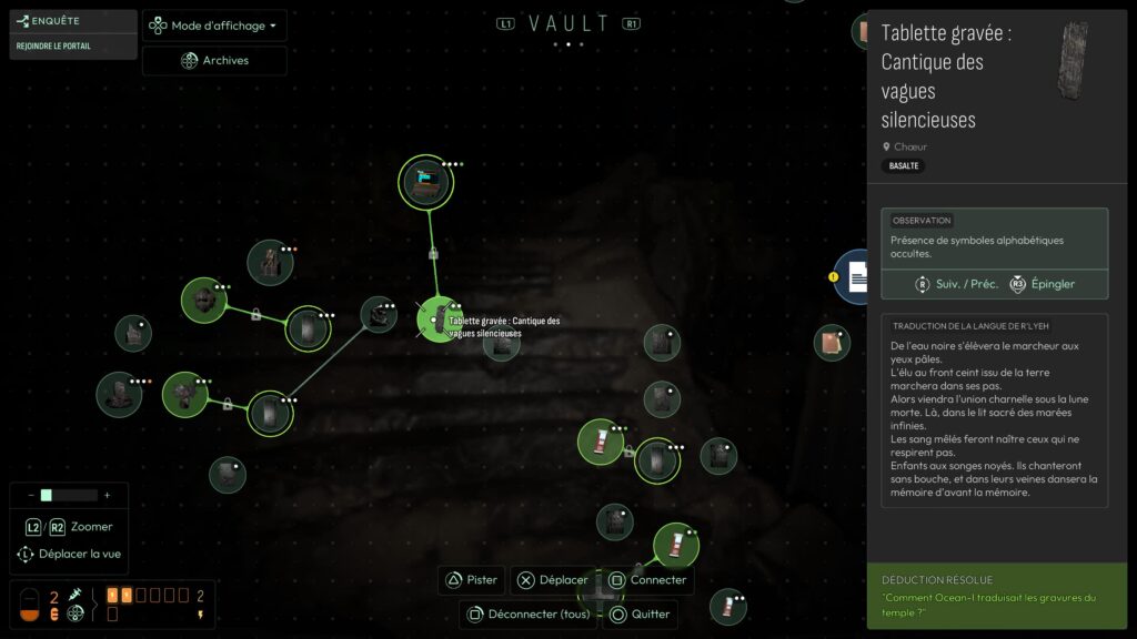 Chaque détail de nos découvertes est stocké sur un écran complètement malléable. On peut classer, coupler, relier toutes les données, pour ensuite répondre à une des mécaniques du jeu : les déductions. Mais pas de hasard ici. En cas de mauvaise réponse, notre santé mentale en prend un coup ! À l’inverse, en cas de bonne réponse, le calme revient un tantinet.