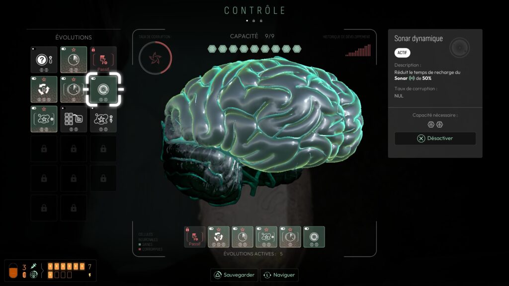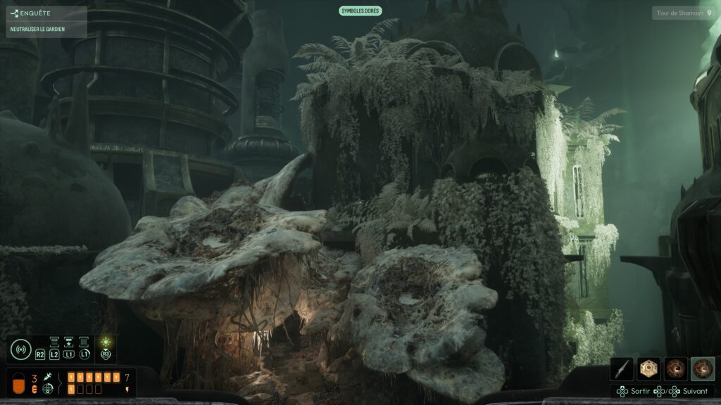 En plus de cela, selon le mode de difficulté choisi, s’approcher et analyser les objets de culte rongent doucement notre santé. Des compétences récupérées sur des tablettes anciennes donneront des buffs à choisir, permettant ainsi de soigner un petit peu notre folie, ou de la stopper. D’ailleurs, une fois certaines parties du cerveau parasitées par la folie, elles deviennent inutilisables.