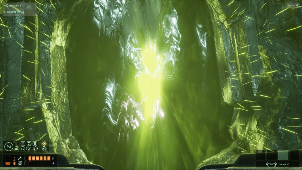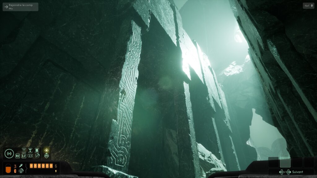 À ma reprise, plus aucune sauvegarde de ce côté du jeu : je reprenais systématiquement à ma chute devant l’entrée du temple avec « continuer » et « charger ». J’ai rapidement remarqué que ce chapitre n’avait littéralement plus aucune sauvegarde automatique. Était‑ce voulu ? Si oui, pourquoi ? Sinon, c’est clairement un bug. Pour éviter le grésillement, j’ai coupé le son… et nouveau bug. À la toute fin du chapitre, impossible de passer le portail. Zoom sur la lueur verte fluo et… plus rien.