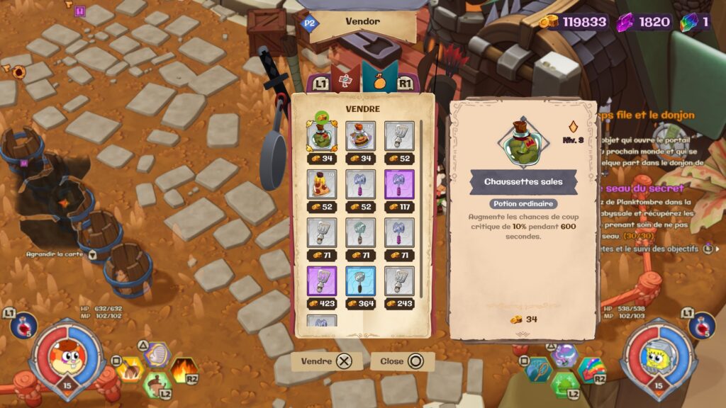La suite de l’aventure permet d’en débloquer d’autres bien entendu ! Du chevalier au corps à corps comme Bob ou Sandy au mage comme Timmy, en passant par le soutien, chaque héros a droit à son « clone ». En effet, malgré quelques idées intéressantes comme la transformation de Sandy, les compétences ont tendance à se ressembler selon le rôle. Logique, direz-vous, mais cela limite un peu le choix du héros en dehors de l’apparence surtout quand on sait que le jeu est jouable jusqu’à 4 joueurs en coop (locale) !