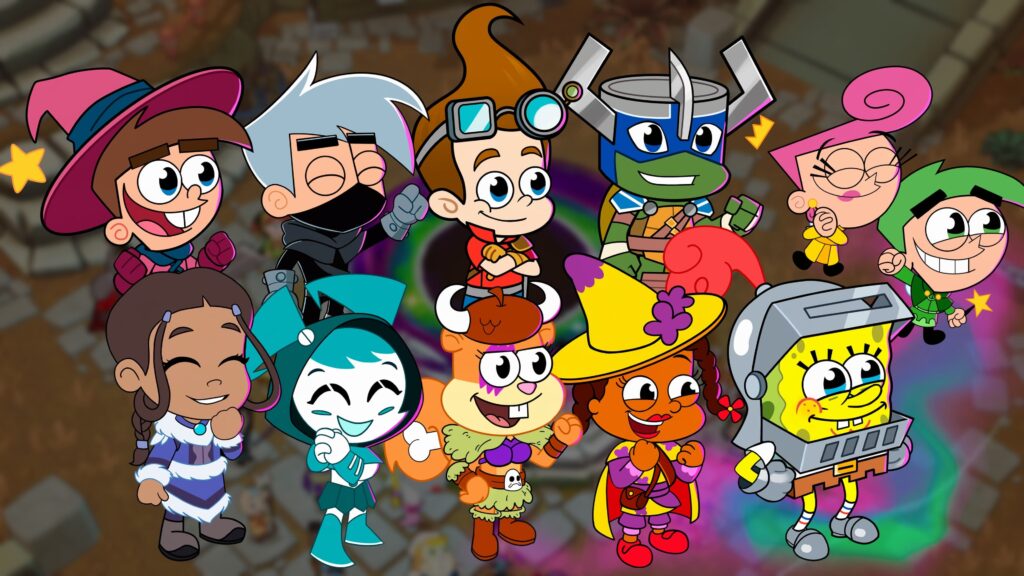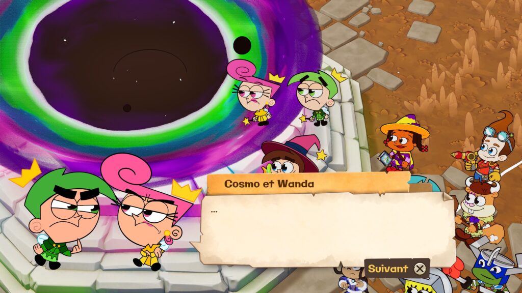 Tout part d’un moment ultra classique : Timmy Turner (Mes parrains sont magiques) est dans sa chambre, en train de jouer a un JDR avec Cosmo et Wanda. Il termine la campagne, s’ennuie un peu comme un gamin lambda et… souhaite que le monde du jeu devienne réel. Pourquoi pas ? Risqué, certes, mais jusque-là, c’est mignon. Puis bing: un bruit étrange, les baguettes tombent, les dés s’illuminent en rouge, et pouf, un portail s’ouvre, aspirant Timmy, ses fées… et d’autres héros Nicktoons venus d’univers différent.