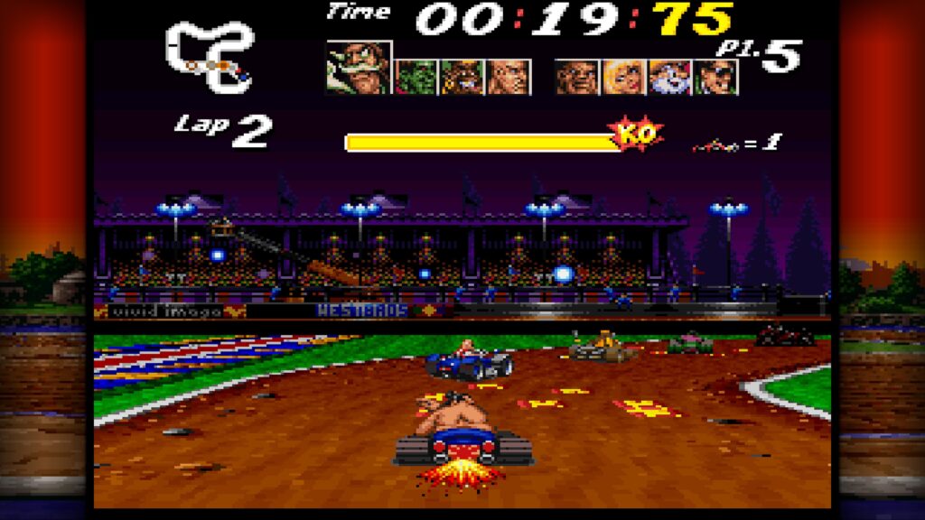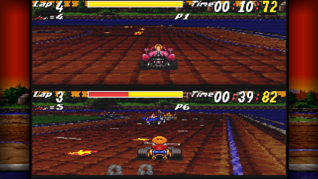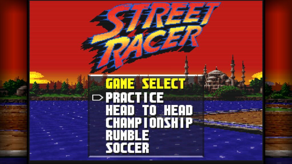 Tout d’abord, Street Racer mise avant tout sur le plaisir immédiat en local de 1 à 4 joueurs, que ce soit en course traditionnelle, en contre-la-montre ou en duel 1 contre 1. Ensuite, le mode Rumble apporte une variante explosive où le but consiste à expulser les autres pilotes d’une arène façon Destruction Derby. De plus, le mode Soccer, ancêtre évident de Rocket League, propose de jouer au football avec des voitures, mais uniquement sur les versions 16 bits.