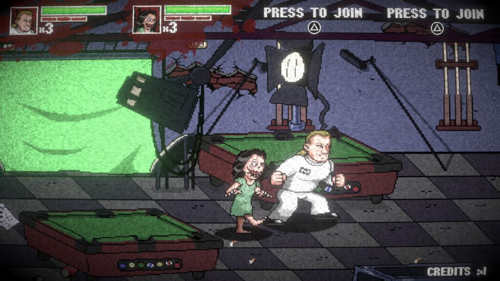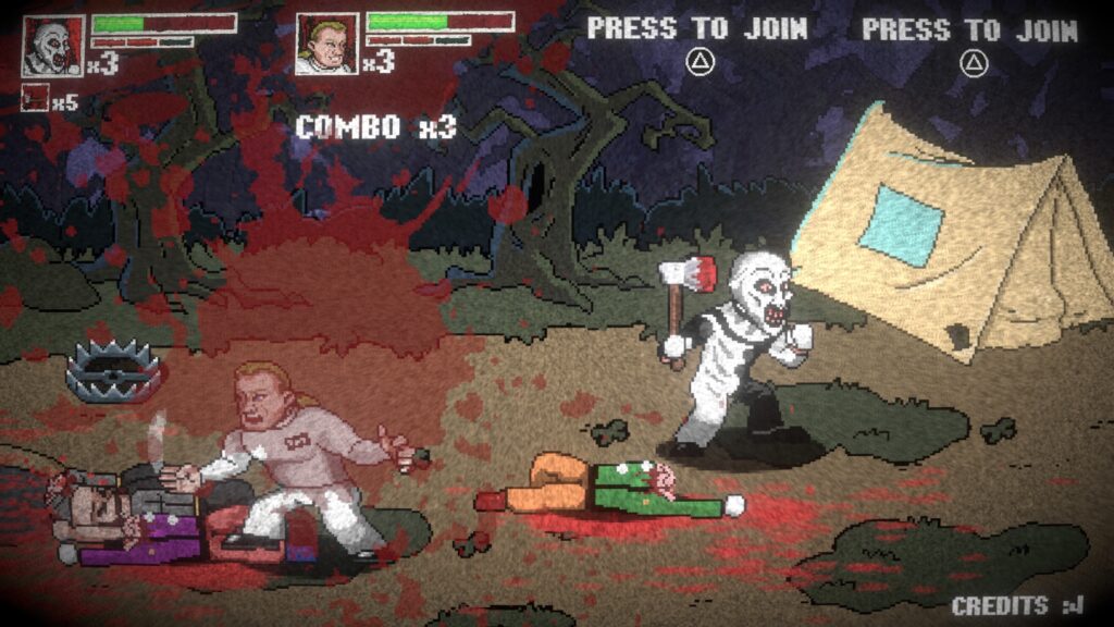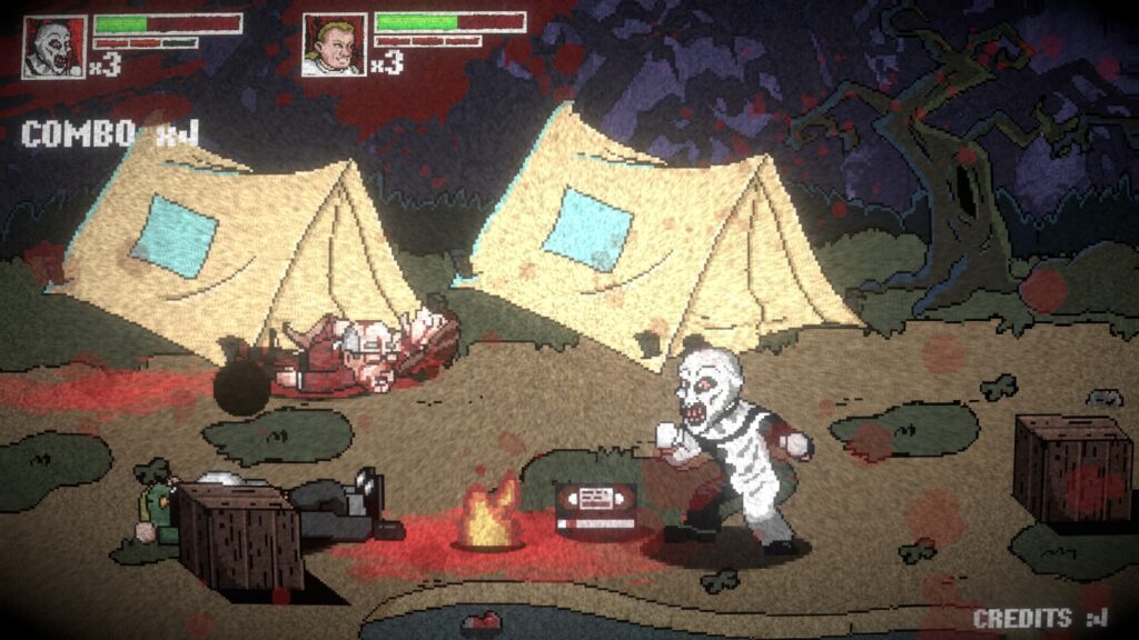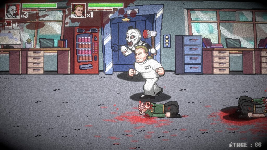 Terrifier : The ARTcade Game, c’est un beat’em up old-school, tout ce qu’il y a de plus basique. On avance, on dégage tout ce qui bouge, on mange un truc sur le sol pour remonter la barre… et on file à droite sans surprise. Les coups sont classiques : attaque rapide, bourrin, saut et une super attaque qui fait mal.