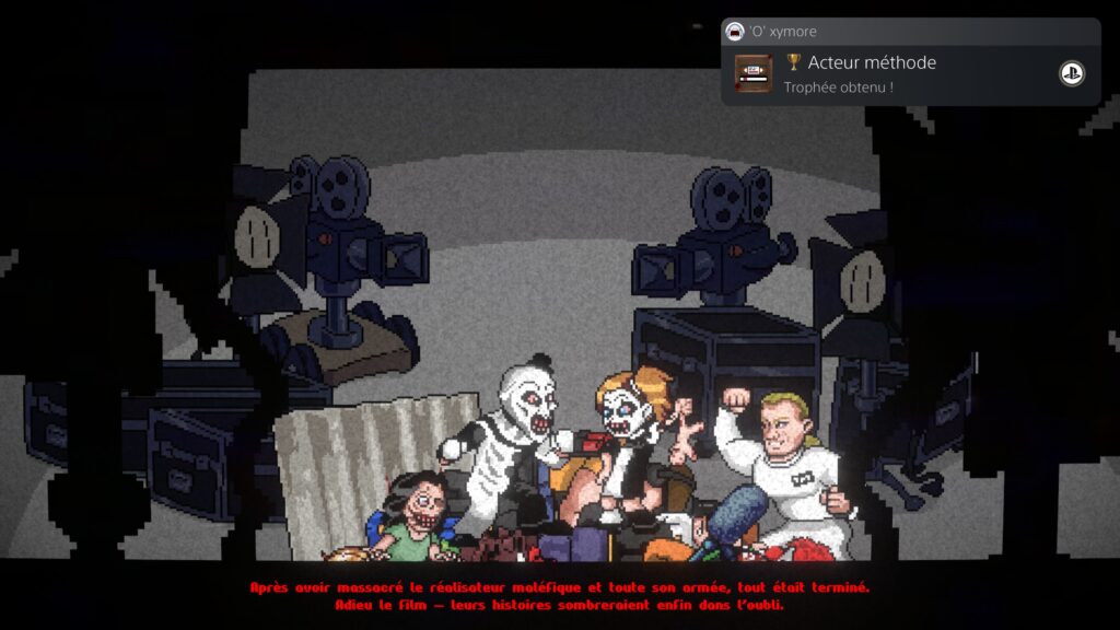 Si le gameplay laisse de marbre, impossible de ne pas apprécier la beauté du pixel art ! L’ambiance crasseuse des films, l’humour noir des finishes, les nombreuses références aux films d’horreur tels que The Ring avec son puits ! Psychose/Bates Motel avec son panneau et sa salle de bain ! Un pur bonheur qui m’a fait passer un excellent moment en compagnie de la team.