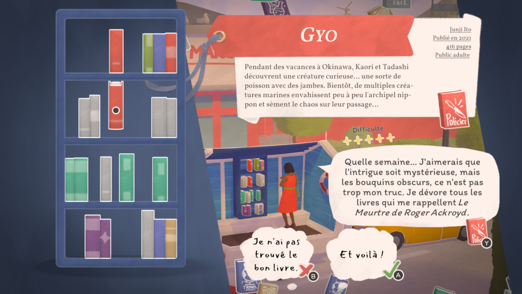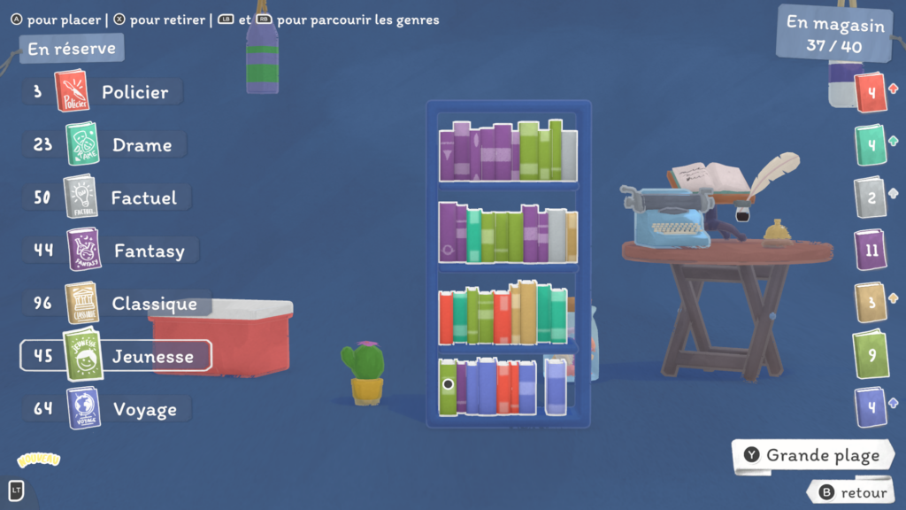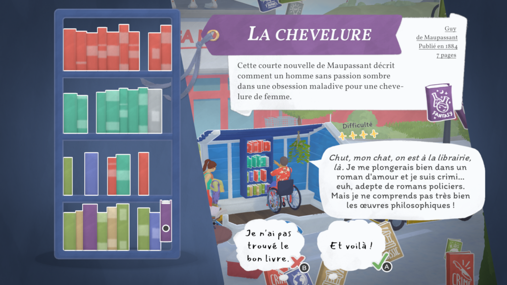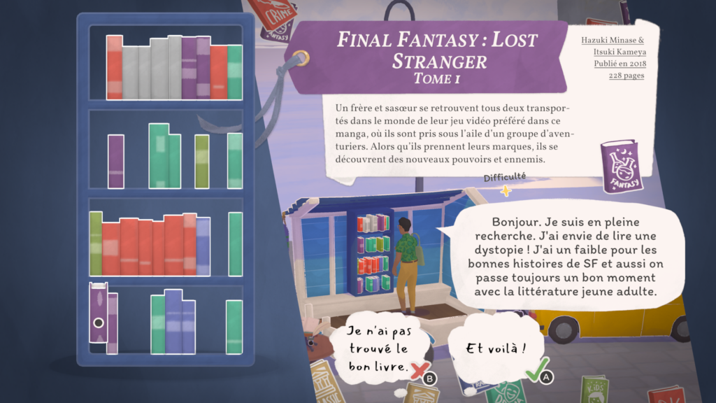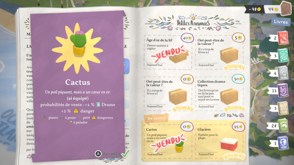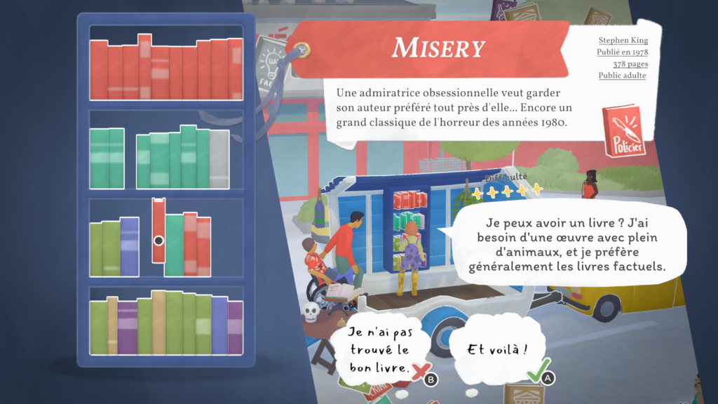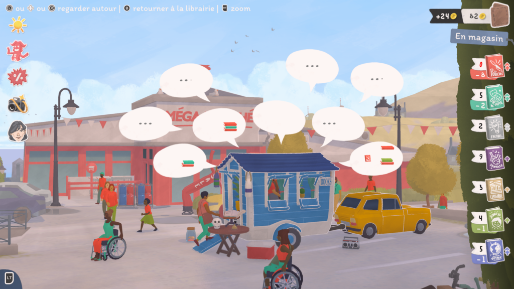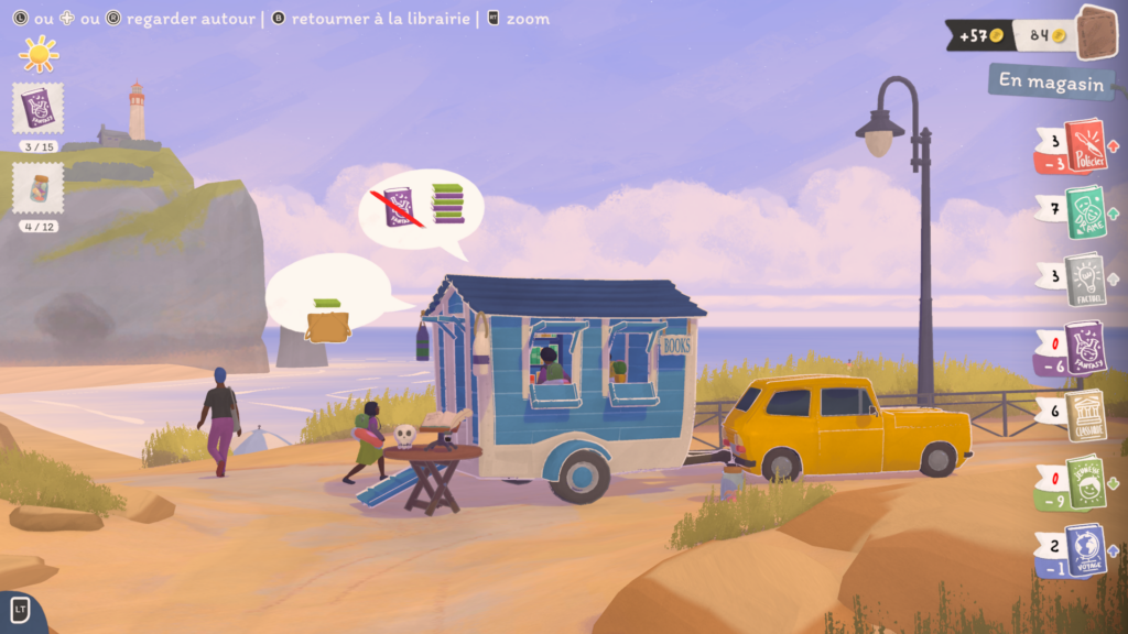 Mais trêve de bavardage ! Le cœur du gameplay de notre pause bouquinage est bien entendu la vente de nos précieux amis reliés. En effet, les habitants de Bouquainville-sur-Mer adorent lire ! Et quoi de plus agréable que de conseiller des livres à nos clients ?