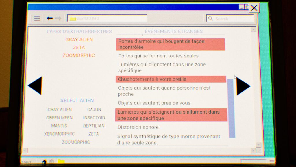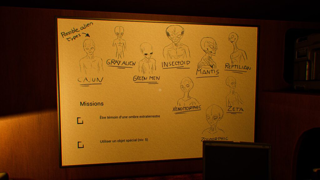 Notre mission principale consiste donc à explorer des lieux reculés signalés pour des rencontres extraterrestres, en utilisant des outils spécialisés comme des détecteurs EMF, des caméras à vision nocturne ou des capteurs de fréquence cardiaque pour identifier le type d’alien présent parmi neuf variantes uniques.