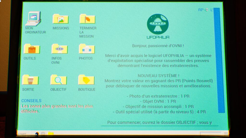 Via notre bon vieux PC dans le van, nous avons des missions autrement dit des lieux à visiter où rôdent de vilains aliens.